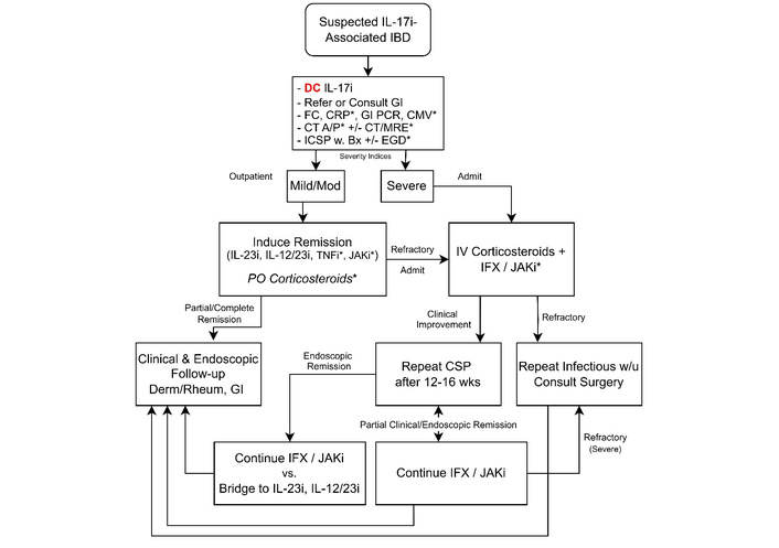Recommendations for management of IL-17i-associated IBD. A/P: abdomen and pelvis; BX: biopsy; CMV: cytomegalovirus; CRP: C-reactive protein; CSP: colonoscopy; CT: computed tomography; DC: discharge; EGD: esophagogastroduodenoscopy; FC: fecal calprotectin; GI: gastroenterology; GI PCR: gastrointestinal polymerase chain reaction; IBD: inflammatory bowel disease; ICSP: ileocolonoscopy; IFX: infliximab; IL-12/23i: interleukin-12/23 inhibitor; IL-17i: interleukin-17 inhibitor; IL-23i: interleukin-23 inhibitor; IV: intravenous; JAKi: Janus kinase inhibitor; MRE: magnetic resonance enterography; PO: oral; TNFi: tumor necrosis factor inhibitor; W: with; W/U: work-up. *: Items marked with an asterisk are discussed in detail in the main text, which outlines specific caveats and clinical contexts in which they should or should not be considered.