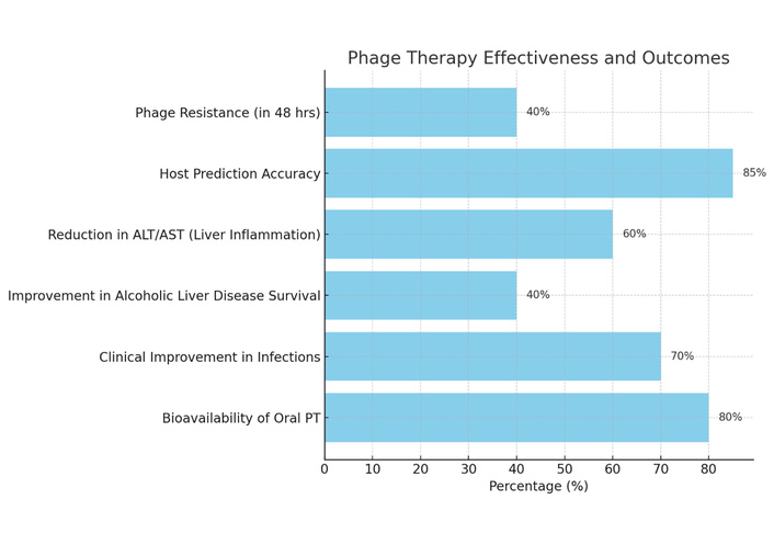 Recent advancements in synthetic biology, such as CRISPR-Cas9, in vitro genome remodelling, and yeast-based phage assembly, facilitate the genetic modification of phages, enhancing their host range and lytic efficacy. In animal models, tailored phage cocktails aimed at Klebsiella pneumoniae, Enterococcus faecalis, and other gut-derived pathogens decreased hepatic inflammatory indicators (ALT, AST) and enhanced survival in alcoholic liver disease [28]. Cocktail therapies have demonstrated greater efficacy than monophage therapy due to the limited host range of phages. The Phage 2 trial indicated that the combination of PT and probiotics more efficiently restored gut microbiota and diminished pathogen burden compared to PT alone. A comparable advantage is shown when used with antibiotics, reducing the likelihood of resistance emergence [28]. Clinical trials in Europe and Asia have demonstrated clinical improvement of patients with chronic infections (including cutaneous, respiratory, gastrointestinal, and urinary tract infections) without notable adverse effects. Oral PT demonstrated high bioavailability in gastrointestinal-targeted therapies, underscoring its promise for hepatic disorders [27]. Figure 4 illustrates the efficacy and results of PT.