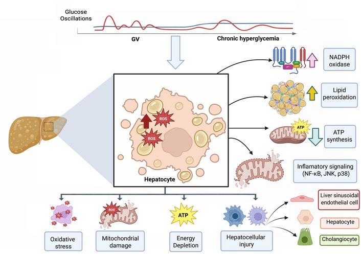 Beyond sustained hyperglycemia, recurrent glucose oscillations exert distinct and disproportionately harmful effects on hepatocytes (Figure 2). Accumulated experimental and clinical evidence indicates that GV acts as an active metabolic stressor capable of inducing hepatocellular injury through mechanisms that go beyond simple chronic metabolic overload. These effects are primarily mediated by exaggerated oxidative stress, mitochondrial dysfunction, and the activation of stress-sensitive inflammatory signaling pathways [54, 57, 58]. Acute glucose fluctuations promote excessive generation of ROS within hepatocytes by disrupting mitochondrial electron transport and activating nicotinamide adenine dinucleotide phosphate (NADPH) oxidase. Compared to stable hyperglycemia, intermittent glucose variations induce larger and faster oxidative bursts, leading to lipid peroxidation, mitochondrial uncoupling, deficient adenosine triphosphate (ATP) synthesis, and loss of cellular energy homeostasis [59, 60].