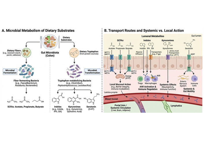 Microbial metabolism of dietary substrates and transport-dependent local vs. systemic actions of gut metabolites. (A) Microbial metabolism: Dietary fibers are fermented by gut microbiota (e.g., Faecalibacterium, Roseburia, Bacteroides) to generate SCFAs (acetate, propionate, butyrate). Dietary tryptophan is metabolized by gut microbes into indole and indole-derived compounds that signal through the AhR, or diverted toward host kynurenine pathway metabolism under inflammatory conditions. Serotonin (5-HT) is synthesized primarily by host enterochromaffin cells from tryptophan, with gut microbiota indirectly regulating its production through microbial metabolites and signaling cues, rather than serving as a direct microbial metabolite. (B) Transport and bioavailability: SCFAs are absorbed through epithelial transporters (MCT1, SMCT1) and act locally to support epithelial ATP production and immune modulation. Indoles cross the epithelium via passive diffusion or transporter-mediated mechanisms and activate AhR in immune cells. Kynurenines enter systemic circulation through amino acid transporters (e.g., LAT1), exerting effects on immune and neural tissues. Serotonin is transported via the SERT and influences gut motility and immune signaling. Portal vein and lymphatic routes distribute metabolites to peripheral organs, including the liver and brain. 5-HT: 5-hydroxytryptamine; AhR: aryl hydrocarbon receptor; ATP: adenosine triphosphate; LAT1: large neutral amino acid transporter-1; MCT1: monocarboxylate transporter-1; SCFAs: short-chain fatty acids; SERT: serotonin transporter; SMCT1: sodium-coupled monocarboxylate transporter-1.