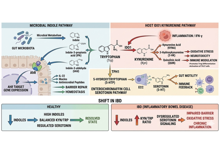 Tryptophan metabolism provides a complementary immunomodulatory axis. Microbial conversion of tryptophan yields indole derivatives [e.g., indole-3-propionic acid (IPA), indole-3-aldehyde (IAld)] that act as endogenous ligands for the aryl hydrocarbon receptor (AhR), driving IL-22 production, antimicrobial peptide expression, and epithelial regeneration processes central to mucosal resilience [6]. Concurrently, host-driven catabolism via indoleamine-2,3-dioxygenase-1 (IDO1) funnels tryptophan into the kynurenine pathway; kynurenines exert context-dependent effects that can either promote immune tolerance or, under persistent activation, contribute to epithelial dysfunction and pro-inflammatory signaling [4, 7]. Dysregulated tryptophan pathway balance, reflected by altered kynurenine/tryptophan (Kyn/Trp) ratios and depleted indole signals, is increasingly implicated in IBD pathophysiology and in extra-intestinal sequelae mediated by the gut-brain axis [8].