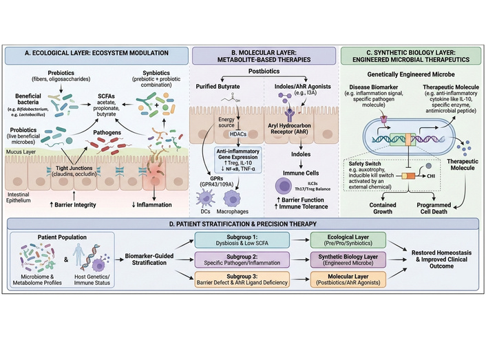 Multi-layered therapeutic targeting of the microbiota–metabolite–immune axis in gastrointestinal inflammation. This schematic illustrates a four-tier framework for therapeutic modulation of metabolite-mediated gut inflammation. (A) Ecological layer (ecosystem modulation): Prebiotics (dietary fibers and oligosaccharides) and probiotics promote the growth of beneficial commensals (e.g., Bifidobacterium, Lactobacillus), increasing SCFAs production (acetate, propionate, butyrate). Enhanced SCFA availability strengthens epithelial tight junctions (claudins, occludin), reinforces the mucus layer, suppresses pathogen expansion, and reduces inflammation. Synbiotics combine both approaches to maximize ecological stability. (B) Molecular layer (metabolite-based therapies): Postbiotics, including purified butyrate and indole-based AhR agonists (e.g., indole-3-aldehyde), act directly on epithelial and immune cells. Butyrate functions as an energy source and HDAC inhibitor, activating G protein-coupled receptors (GPR43, GPR109A) to suppress NF-κB signaling and pro-inflammatory cytokines while promoting Tregs. Indoles activate AhR signaling in immune cells, enhancing barrier function and immune tolerance. (C) Synthetic biology layer: Genetically engineered microbes detect disease-associated biomarkers (e.g., inflammatory signals) and produce therapeutic molecules (e.g., IL-10, antimicrobial peptides). Built-in safety switches (auxotrophy, inducible kill switches) ensure containment and controlled microbial survival. (D) Precision therapy: Biomarker-guided patient stratification based on microbiome, metabolome, and host immune/genetic profiles directs patients toward ecological, molecular, or synthetic biology-based interventions, ultimately restoring gut homeostasis and improving clinical outcomes. AhR: aryl hydrocarbon receptor; DCs: dendritic cells; HDAC: histone deacetylase; NF-κB: nuclear factor kappa-B; SCFAs: short-chain fatty acids; Tregs: regulatory T-cells.