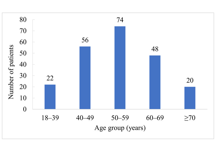 A total of 220 patients with CLD were included in the study, with a mean age of 54.5 ± 11.9 years, of whom 138 (63%) were male. Figure 1 demonstrates the age distribution of the study population. The majority of patients were in the 50–59 year age group (33.6%), followed by 40–49 years (25.5%) and 60–69 years (21.8%). Younger patients aged 18–39 years accounted for 10%, while 9.1% were aged ≥ 70 years. Overall, 96 patients (43.6%) had decompensated liver disease. Participants were categorized into tertiles according to baseline NHHR. Baseline characteristics according to NHHR tertiles are presented in Table 1. Mean NHHR increased significantly across tertiles (P < 0.001), while age and sex distribution were comparable among groups. HDL-C levels decreased progressively, and non-HDL-C levels increased across increasing NHHR tertiles (both P < 0.001). Higher NHHR was also associated with greater liver disease severity, reflected by a stepwise increase in MELD-3.0 scores (P = 0.028) and a corresponding decrease in serum albumin levels (P < 0.001). In contrast, international normalized ratio (INR), platelet counts, and serum bilirubin did not differ significantly across tertiles. The distribution of CLD etiology was similar among NHHR categories. Although a trend toward a more advanced Child-Pugh class was observed with increasing NHHR, this did not reach statistical significance. Importantly, the proportion of patients with decompensated cirrhosis increased significantly across NHHR tertiles, rising from 31.1% in tertile 1 to 53.4% in tertile 3 (P < 0.001).