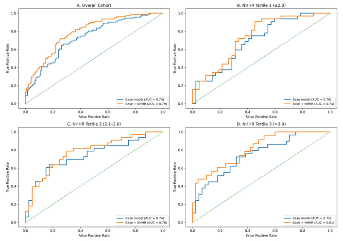 ROC curves of the base model and base model plus NHHR across NHHR tertiles. ROC curves comparing the discriminatory performance of the base predictive model (incorporating age, sex, and MELD-3.0 score) and the model augmented with NHHR across chronic liver disease cohorts: (A) overall cohort, (B) NHHR tertile 1 (≤ 2.0), (C) NHHR tertile 2 (2.1–3.0), and (D) NHHR tertile 3 (> 3.0). For each panel, the true positive rate (sensitivity) is plotted against the false positive rate (1 – specificity). The AUC for each model is indicated in the legend. The diagonal dashed line represents the reference line for random classifier performance. AUC: area under the receiver operating characteristic curve; MELD: Model for End-Stage Liver Disease; NHHR: non-high-density lipoprotein/high-density lipoprotein cholesterol ratio; ROC: receiver operating characteristic.