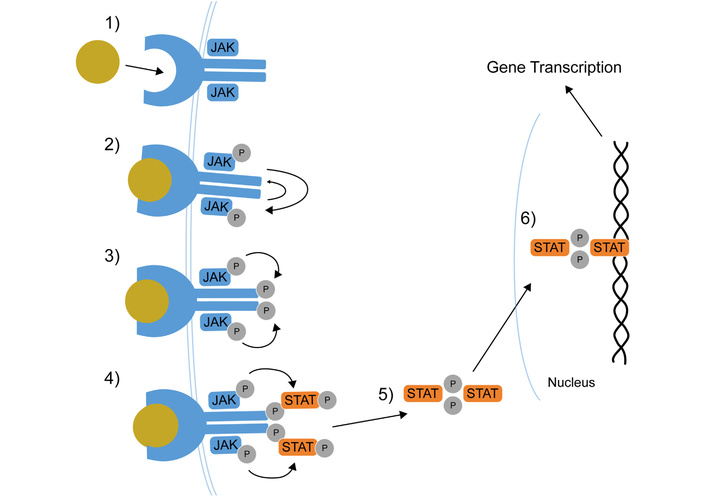 The JAK–STAT pathway and its members. Cytokine receptor binding; receptor-JAKs phosphorylation; JAKs phosphorylation; STATs phosphorylation; STATs dimerization; STAT dimers translocation to the nucleus for gene transcription. JAK: Janus kinase; P: phosphate group; STAT: signal transducer and activator of transcription. Reprinted from [16]. © Lin CMA, Cooles FAH, Isaacs JD 2020. Licensed under a Creative Commons Attribution 4.0 International License.