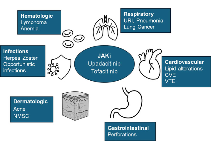 JAK inhibitors’ adverse effects. Reprinted from [45]. © The Author(s) 2025. Licensed under a Creative Commons Attribution 4.0 International License.