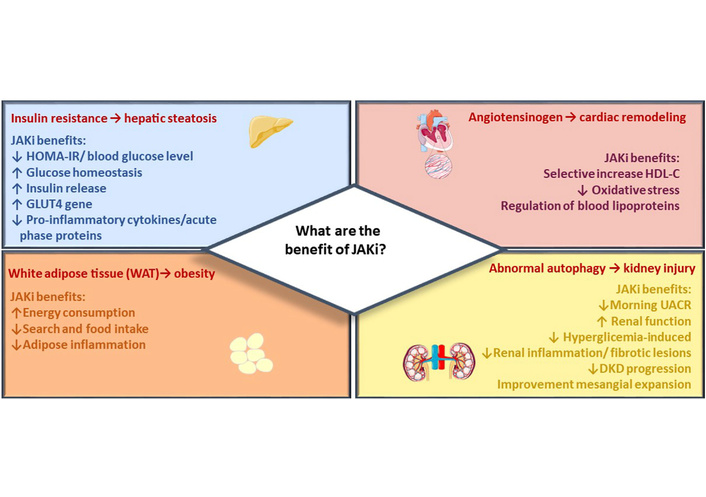 JAK inhibitor metabolic effects. The figure summarizes the main beneficial effects of JAK inhibitors across target organs of metabolism. Reprinted from [110]. © 2023 Collotta, Franchina, Carlucci and Collino. Distributed under the terms of the Creative Commons Attribution License (CC BY).
