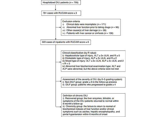 As shown in flowchart at Figure 1, a total of 795 patients diagnosed with DILI were searched, including 781 patients with RUCAM score ≥ 3. After further selection by exclusion criteria, three hundred and twenty-two DILI patients were finally included in the analyses.