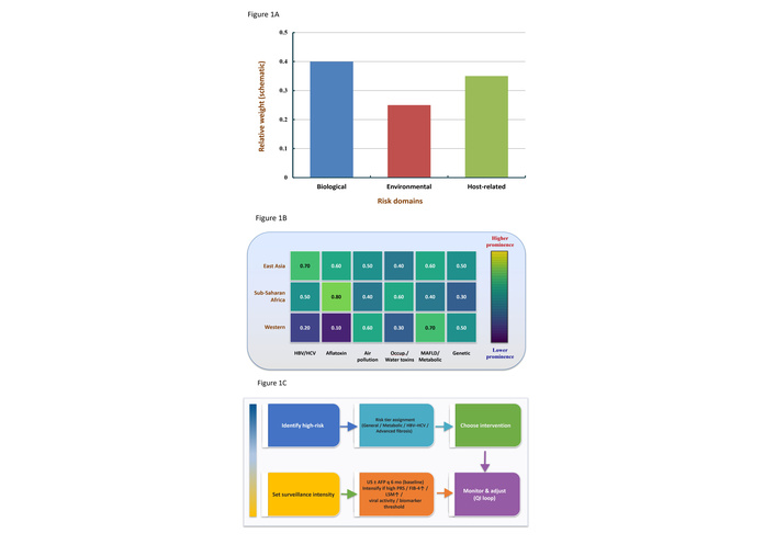 Framework for precision prevention of primary liver cancer: risk domains, regional context, and decision pathway. (A) Domain-level contribution of major risk categories—biological (e.g., HBV/HCV, aflatoxins), environmental (e.g., air pollution, occupational/waterborne toxins), and host-related (e.g., MAFLD/metabolic, genetics)—displayed as relative weights (schematic). (B) Cross-regional heatmap (schematic) illustrating the prominence of specific risk factors across East Asia, sub-Saharan Africa, and Western settings (HBV/HCV, aflatoxin, air pollution, occupational/water toxins, MAFLD/metabolic, genetic). (C) Prevention-strategy flow chart outlining the decision path from high-risk identification and risk-tier assignment (general/metabolic/HBV–HCV/advanced fibrosis) to choice of intervention (risk elimination; early warning & targeted management; chemoprevention), setting surveillance intensity (baseline US ± AFP every 6 months; intensify if high PRS, elevated FIB-4 or LSM, viral activity, or biomarker thresholds), and monitor-and-adjust (QI loop). Values in panels A and B are illustrative placeholders to be replaced with cohort-specific estimates as available. AFP: alpha-fetoprotein; FIB-4: fibrosis-4 index (also called the fibrosis-4 score); HBV: hepatitis B virus; HCV: hepatitis C virus; LSM: liver stiffness measurement; MAFLD: metabolic dysfunction–associated fatty liver disease (i.e., NAFLD: non-alcoholic fatty liver disease); PRS: polygenic risk score; QI: quality improvement; US: ultrasound.