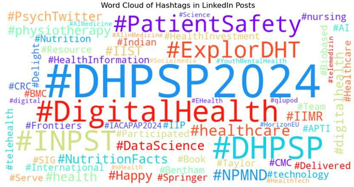 The LinkedIn data showcases a diverse array of hashtags, with a significant focus on health and technology (Table 5, Figure 6). The most frequently used hashtags are #DHPSP2024, #DHPSP, and #DigitalHealth, indicating a strong emphasis on digital health and patient safety. Other notable hashtags include #PatientSafety, #ExplorDHT, and #healthcare, underscoring the importance of healthcare and patient well-being. Additionally, there’s a presence of hashtags related to professional and academic communities such as #INPST, #NPMND, and #IIST. The data also highlights interests in specific fields like #physiotherapy, #NutritionFacts, and #DataScience. The variety of hashtags, including those with just one mention, like #technology, #telehealth, and #AI, reflects a broad engagement with topics spanning health, technology, and professional development on LinkedIn (Table 5, Figure 6).