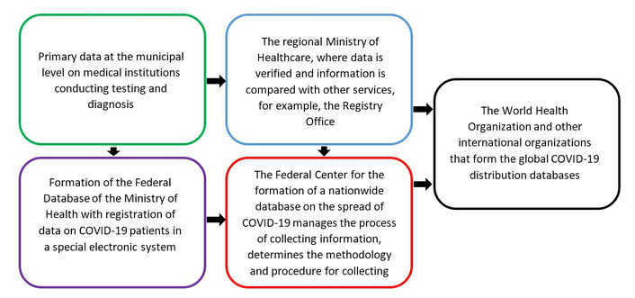 At the regional level, statistical information is received daily from municipal governments, where data is transmitted from health facilities (Figure 1). Since the WHO only provides recommendations for monitoring the spread of coronavirus, data collection and processing systems may vary at the national level, so direct cross-country comparison of raw data without pre-processing is difficult. To investigate the patterns of a new coronavirus infection spread within the borders of different countries, it is desirable to use databases from countries that use similar methods of recording the number of people who became infected, recovered, and deceased as a result of COVID-19 infection when compiling statistics.