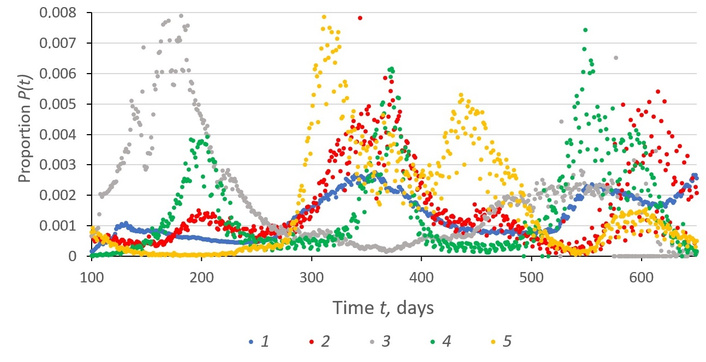 Figure 2 shows graphs of the proportion of daily increase in cases of COVID-19 coronavirus by countries of different continents (P(t) = [F*(t + ∆t) – F*(t)]/∆t, ∆t = 1 day) for the period from t0 = 100 days (04/09/2020) up to tk = 650 days (10/09/2021). Depending on the method of collecting and presenting pandemic information, relatively smooth and non-smooth with sharp daily changes in the value of P(t) differ. The graphs show a shift in the position of infection maxima by territories. During the period under review (2 years), four waves of morbidity were identified with a tendency to increase their amplitude.