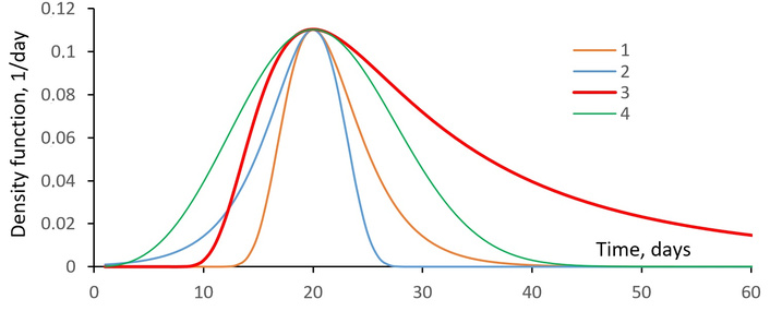 Different types of density function curves for maximum and minimum values. 1–2—Gumbel’s function, 3–4—Fréchet function with the same parameters α = 0.3/day, τ0 = 20 days, θ = 9 days.