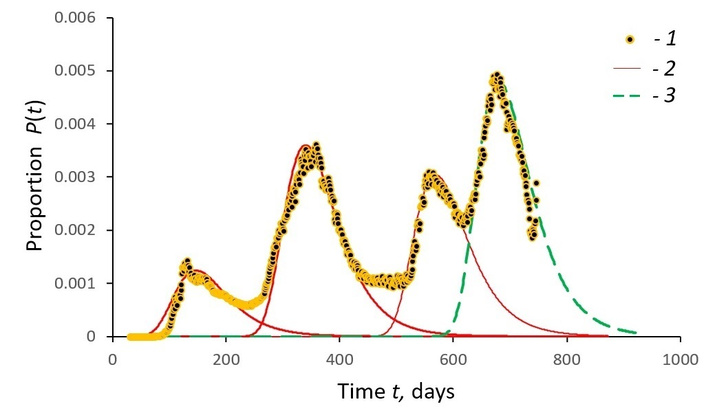 Figure 4 shows the first four waves of the COVID-19 epidemic in Russia over two years: observed data and forecasted calculations of the population’s response using Equation S6. The calculations (dotted curve of Figure 4) were performed at the time of 10/25/2021 (666 days of observation) and were confirmed by the current statistics on COVID-19 cases until the beginning of January. However, from 01/14/2022 (day 747), the trend was broken due to the emergence of a new omicron strain of COVID-19, whose epidemic is radically different in terms of both the time of onset and the scale of manifestation, and requires a special study.