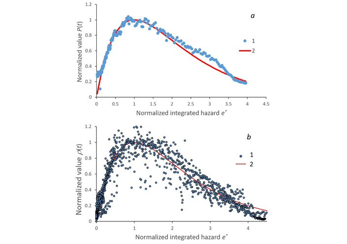 Reliability functions are analytically related to P*(t) and to each other according to Equation S3, therefore, specifying one of them, we obtain all the others. For example, F*(t) = exp[–E*(t)] is the unreliability, which exponentially increases with decreasing hazard. In particular, it reflects the relative increase in the number of infected with decreasing risk of getting infected at the last stages of the pandemic. The meta-dependence p(τ) = αE*(τ) + ε is reliably manifested in the Russian Federation population response and satisfies Equation 1 p(τ) = 0.0217E*(τ) – 0.0169 with a correlation coefficient R = 0.919.