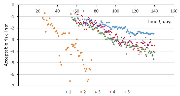 At the first hierarchical level, the exponential hazard function E(t) = αexp[α(t – tm)] is manifested, and at the second level, the twice-exponential reliability function P*(t) (Equation 5). By analogy, at the zero level of complexity, we should expect an exponential dependence of AR α(t) (the riskiness of the situation) on time: