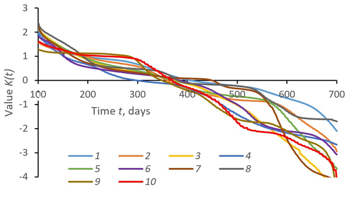 Territorially, the values θ = b/α and tm = –αθ/α vary, indicating the optimality and environmental conditions of the epidemic process realisation. Coefficients a and b of Equation 8 vary by country, for example, for Russia K = –0.00488t + 2.06 = –0.00488(t – 422.9) (correlation coefficient R = –0.98), for the USA K = –0.00625t + 2.26 = –0.00625(t – 362.1) (R = –0.98), for Brazil K = –0.00929t + 3.09 = –0.00929(t – 332.6) (R = –0.96). In Russia, γ = 0.00488/days, tm = b/γ = 422.9 days, the proper time value θ = γtm/α = b/α = 78.1 days. The value of tm indicates the moment of culmination of the epidemic process, when K = 0 and the hazard has a critical value E*(tm) = 1. Later tm dates characterize the best pandemic situation in terms of disease spread: Russia—423 days, South Africa—400 days, Germany—247 days, etc.