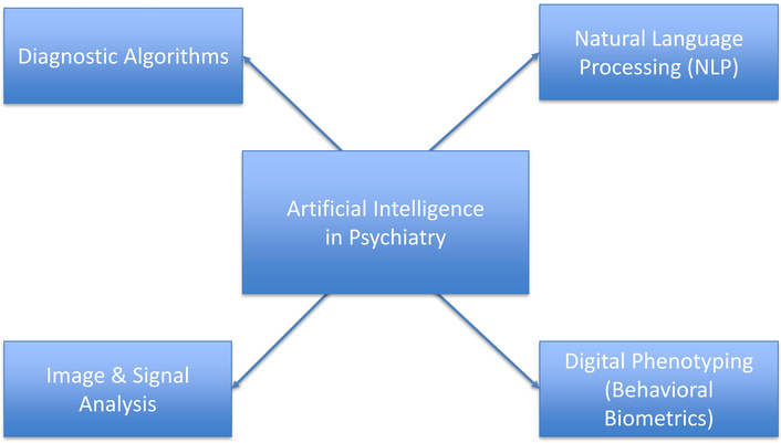 AI and its subfields, machine learning (ML), deep learning (DL), and natural language processing (NLP), enable computers to learn from clinical, behavioral, and linguistic data to uncover patterns that support diagnosis and treatment [27]. These models are typically developed through training, validation, and testing processes that help optimize performance and ensure dependable results in clinical applications. By combining these learning methods, AI enhances the capacity to interpret complex data and generate insights that complement professional judgment [28]. AI is reshaping many areas of healthcare, including psychiatry, with the goal of improving diagnostic accuracy, efficiency, and early detection of mental health conditions. Its application in psychiatry spans four main domains: diagnostic algorithms, NLP, image and signal analysis, and digital phenotyping through behavioral biometrics (Figure 1) [29]. AI-driven diagnostic tools are transforming psychiatric evaluations by offering standardized, data-based assessments. Using ML models, these systems analyze patient data to identify patterns and predict mental health disorders. Algorithms such as neural networks, support vector machines, and decision trees have been trained on clinical datasets to detect conditions like bipolar disorder, schizophrenia, and depression [30]. One key advantage of these tools is their ability to capture complex, nonlinear relationships that clinicians might overlook. Studies, including those from the Predictive Analytics Competition, demonstrate how integrating data on mood, cognition, and sleep can enhance the accuracy of diagnosing major depressive disorder, outperforming traditional methods [31]. These systems can also reduce diagnostic bias and offer consistent second opinions, though their reliability is tied to the quality and representativeness of the training data, which poses challenges for underrepresented populations [32].