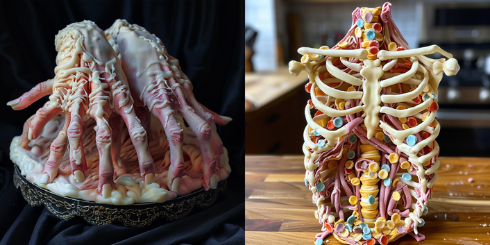 A serious phobia of my own hands—images from participant Pink Towel (Beck score 26). ‘Maybe others wouldn’t associate this ‘edible hands’ [image] with me as much, but it feels pretty close to me […] Lately, I’ve developed a serious phobia of my own hands.’ (Pink Towel). 1. [Prompt 35]—Most expressive: ‘edible hands’ (one upscale); 2. [Prompt 10]—Most expressive: ‘messy ribcage made out of cake’ (one variation, one upscale).