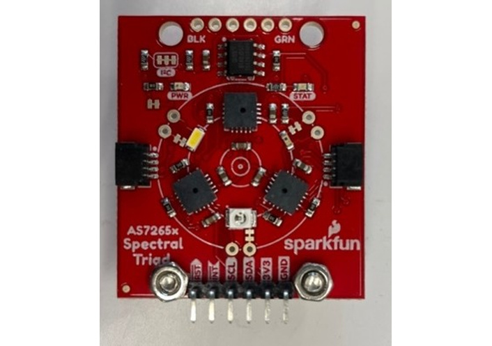 Depending on the sensor used in the build, the resolution of the wavelength reading differs. The built-in APDS-9960 sensor of the Arduino BLE Sense consists of 3 color channels: red—625 nm, blue—465 nm, and green—525 nm. The Sparkfun AS7265x consists of 18 color channel outputs ranging from 410 to 940 nm. First, a calibrated spectrometer was used to confirm the wavelength of the phototherapy light source. Both versions of the 3D printed irradiance meter were then exposed to the same light, and the output was observed.