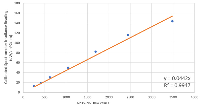 Comparison of true value vs APDS-9960 irradiance reading.