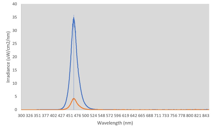 The results of the filter test are shown in Figure 8. As can be seen, the peak of both the source and the filtered light occurs at 455 nm; therefore, the filter does not cause any spectral shift in the 455 nm range. Secondly, the peak irradiance of the spectrum with the filter is significantly lower. Thus, the intended effect of the filter has been achieved. The maximum exposure of the sensor has been lowered such that it will operate within the desired range, and the wavelength of light was verified not to shift as a consequence of passing through said filter.