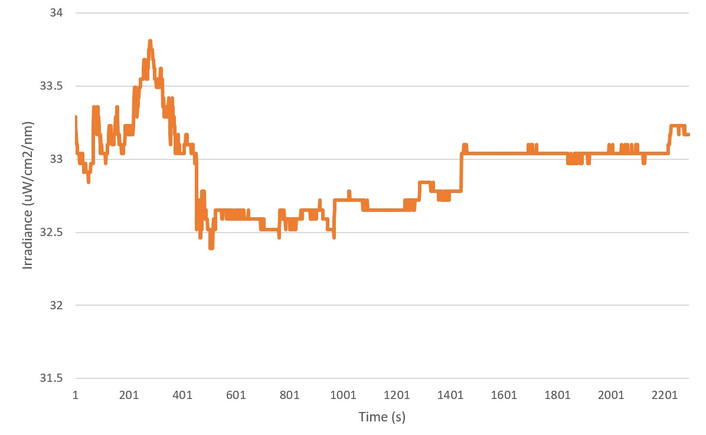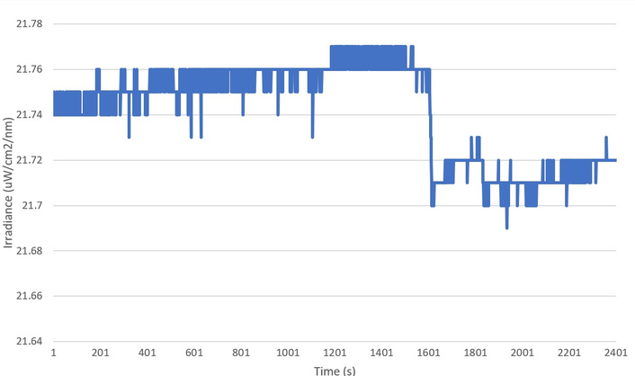Figure 9 plots the irradiance meter readings over 40 minutes while exposed to a fixed light source. The AS7265x irradiance meter outputs an average value of 21.74 ± 0.04 uW/cm2/nm.