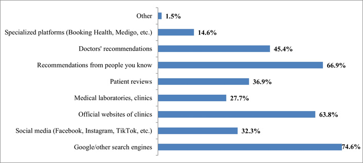Therefore, the experience of Ukrainian patients covered both traditional (recommendations from acquaintances—66.9%) and digital channels (search internet systems—74.6%, official clinic websites—63.8%).