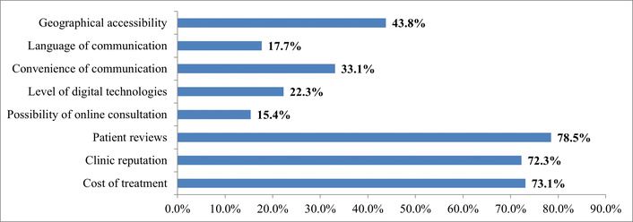 An analysis of responses from consumers of medical services showed that patient reviews play a primary role in choosing a clinic (78.5% of total responses), so it is important to establish quality feedback on the clinic’s website and social media pages. The second most important criterion in the decision-making process for consumers of medical services is the cost of treatment (73.1% of total responses). Third—the clinic’s reputation (72.3% of total responses), which indicates the importance of the quality of medical services and reputation management, including digital reputation management.