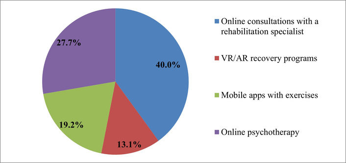 The second most popular area is online psychotherapy (27.7%), which highlights the growing role of psycho-emotional support in the rehabilitation process. This result shows that patients view rehabilitation as a comprehensive process, including the restoration of emotional stability and the reduction of stress levels.