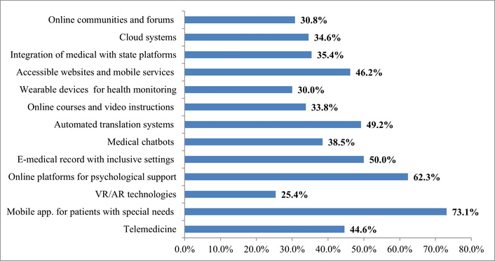 The results show that patients highly value digital solutions that directly enhance the accessibility, personalization, and continuity of healthcare. The most in-demand solutions were mobile applications (e.g., medication reminders, exercises, condition monitoring) for people with special needs (73.1%) and online psychological support platforms (individual and group sessions) (62.3%), highlighting the growing need for daily support, self-directed rehabilitation, and access to mental health. Respondents also noted the importance of electronic medical records with inclusive settings (e.g., easy access for patients with visual/hearing impairments) (50.0%) and accessible websites and mobile services (adapted for people with visual, hearing, motor impairments) (46.2%), online communities and forums for people with disabilities and their families (30.8%) indicating the critical role of digital inclusivity in basic medical infrastructure. Telemedicine (online consultations with doctors and rehabilitation specialists) (44.6%), automated translation systems (text, voice, sign language) (49.2%) and medical chatbots with adapted functions for people with disabilities (38.5%), online courses and video instructions on recovery for patients and caregivers (33.8%) remain significant, providing quick access to information and doctors, especially for people with hearing, vision or mobility impairments. Innovative technologies such as VR/AR technologies for physical and psychological rehabilitation (25.4%) and wearable devices (smart bracelets, sensors) for health monitoring (30.0%), although demonstrating lower levels of support, are still perceived as promising additions to physical and psychological recovery. The focus on data sharing and the digital ecosystem is reflected in the importance of integrating medical and government platforms (e.g., Ukrainian portal of state services “DIIA”) (35.4%) and cloud systems for storing and exchanging medical data between doctors and patients (34.6%).