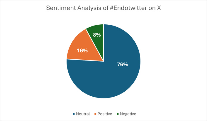 The analysis showed that 76% of the posts under the #EndoTwitter hashtag were neutral, indicating their primarily informative nature. Positive sentiment appeared in 16% of the posts, mostly reflecting patient experiences, marketing efforts, and conference-related updates. In contrast, 8% of the posts exhibited negative sentiment, often driven by adverse experiences or disease-related news.