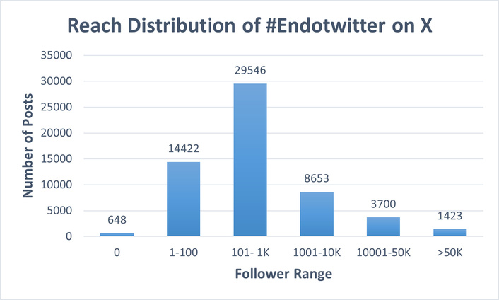 Individuals using #EndoTwitter with zero followers generated 648 posts. Those with fewer than 100 followers collectively generated 14,422 posts, while users with follower counts ranging from 100 to 1,000 contributed a cumulative total of 29,546 posts. Users possessing followers within the range of 1,000 to 10,000 collectively posted 8,653 times. For participants with follower counts spanning from 10,000 to 50,000, the collective count amounted to 3,700 posts. Remarkably, individuals boasting follower counts surpassing 50,000 collectively published approximately 1,423 posts. Figure 2 illustrates the reach distribution of #EndoTwitter on X.