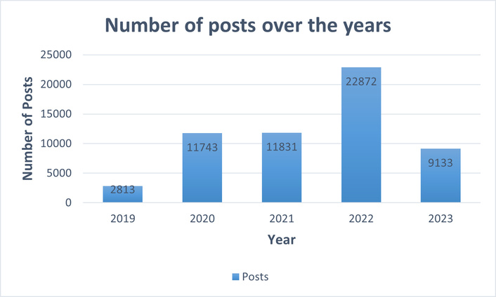 Notably, the analysis revealed an increase in the frequency of the posts containing #EndoTwitter hashtag over the years with a peak in frequency during the year 2022, where the recorded number of posts amounted to 22,872. In the years 2020 and 2021, contributions were closely comparable, yielding post counts of 11,743 and 11,831, respectively. A total of 9,133 posts were documented in 2023, while the least substantial contribution was identified in the inaugural year of 2019, amounting to 2,813 posts. Figure 3 illustrates the activity timeline of #EndoTwitter on X.