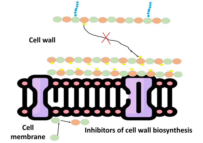 Mechanism of action of inhibitors of cell wall biosynthesis. That illustrates how antimicrobial agents disrupt peptidoglycan synthesis, blocking the linkage between cell wall precursors, weakening the cell wall integrity, ultimately causing microbial cell lysis.