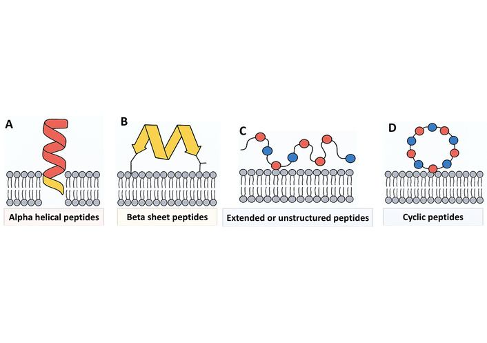 Structural classes of antimicrobial peptides (AMPs) and their interactions with microbial membranes. The four major structural classes of AMPs: (A) α-helical peptides, which assume an amphipathic helical conformation upon interaction with lipid bilayers; (B) β-sheet peptides, whose rigidity is provided by disulfide bonds that stabilize a β-structure; (C) extended or unstructured peptides, which lack a defined secondary structure and are thus able to traverse the membrane and/or target intracellular molecules; and (D) cyclic peptides, containing covalent cyclization that confers stability, protease resistance, and often broad spectrum activity. These diverse structures provide the basis for different modes of membrane interaction and antimicrobial activity.