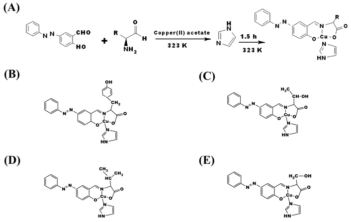 The azo-benzene amino acid Schiff base copper(II) complexes and the synthetic route of obtaining them. (A) Typical synthetic procedures for azo-amino acid Schiff base copper(II) complexes. Illustration of the structures of the complexes: (B) CuTyr; (C) CuThy; (D) CuVal; (E) CuSer. Structures were drawn using ChemDraw.
