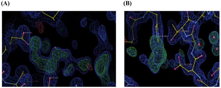 The result further revealed that in addition to the active site residues Asp52 and Glu35 of egg white lysozyme, the copper(II) ions were coordinated to Ser72, Ser91, Leu129, and His15. Electron density corresponding to the metal complex ligands was observed around His15 (Thr89), Glu35, and Asp52 together with copper(II) ions, while only copper(II) ions were observed bound to Asp101, Leu129, Ser91, and Ser72, without additional ligand density. For example, electron density was observed around the complex coordination of Glu35, while the ion binding (focused in this study) was around His15, Arg21, Arg14, and Thr89, as depicted in Figure 3.