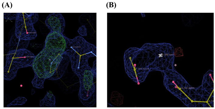 Binding sites of copper(II) complex as a preliminary experiment (A) and copper(II) ion (B).