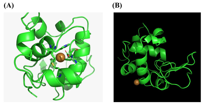 Structure of egg white lysozyme in the presence of copper(II) ion using (A) AutoDock and (B) MIB2.