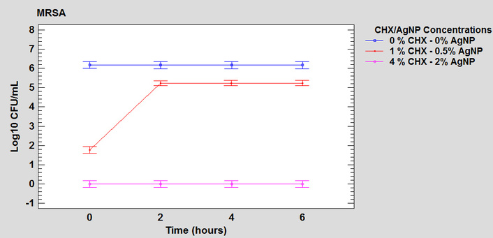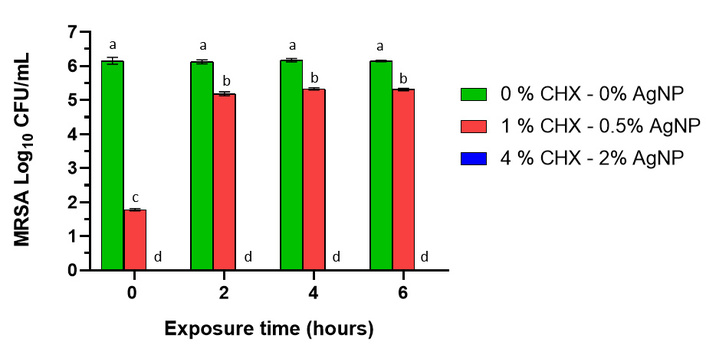 Effect of chlorhexidine (CHX) with silver nanoparticles (AgNP) against methicillin-resistant Staphylococcus aureus (MRSA), expressed as percentage of bacterial survival (%) at 0, 2, 4, and 6 hours post-treatment on an inert metal surface. No viable bacteria were obtained with the 4% CHX-2% AgNP treatment (blue bar). Error bars indicate the standard error of the mean, and there are no statistically significant differences between bars that share the same letter after a significant (p < 0.05) two-way ANOVA (p < 0.05, Fisher’s Least Significant Difference).