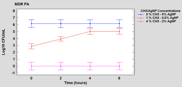 Graph of interaction between the factors of time and concentration of the formulation in the antimicrobial activity on the steel surface against MDR-PA. MDR-PA: multi-resistant Pseudomonas aeruginosa; CHX: chlorhexidine; AgNP: silver nanoparticles.