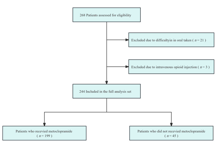 This retrospective, single-center observational cohort study was conducted at Qinghai University Affiliated Hospital (China) to evaluate the real-world effectiveness of prophylactic metoclopramide in reducing the incidence of OINV among patients with cancer-related pain. This was an observational study without randomization. The unequal group sizes (199 vs. 45) reflect real-world prescribing patterns: during the study period, prophylactic metoclopramide gradually became common practice in our department, resulting in more patients receiving metoclopramide at opioid initiation. Patient data were extracted from electronic medical records between January 2023 and December 2024. The study was approved by the Ethics Committee of Qinghai University Affiliated Hospital (Approval No. AF-RHEC-0018-01) under institutional protocol 2018-SF-113. The requirement for informed consent was waived due to the retrospective nature of the study and anonymized data handling.