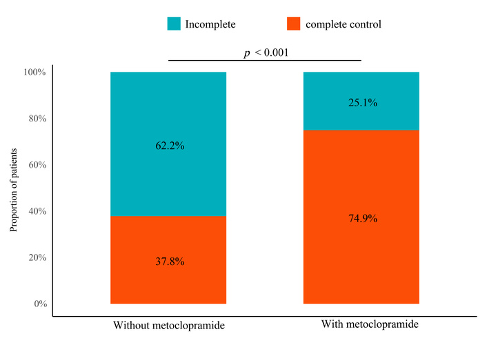 Distribution of complete control (CC) outcomes with and without prophylactic metoclopramide.