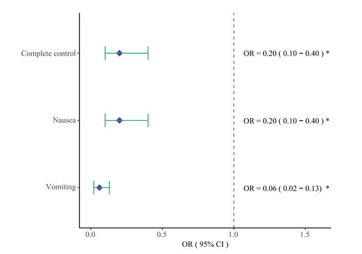 Nausea control was achieved in 74.9% of patients receiving prophylactic metoclopramide, compared to 37.8% in the control group (OR = 0.20, 95% CI: 0.10–0.40; p < 0.001). Vomiting control was observed in 95.0% vs. 51.1%, respectively (OR = 0.06, 95% CI: 0.02–0.13; p < 0.001). These differences are visualized in Figure 4. Multivariate logistic models confirmed the associations, and univariate analyses yielded consistent findings (Figures S2 and S3).