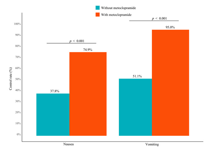 Comparison of nausea and vomiting control rates between patients with and without metoclopramide prophylaxis.