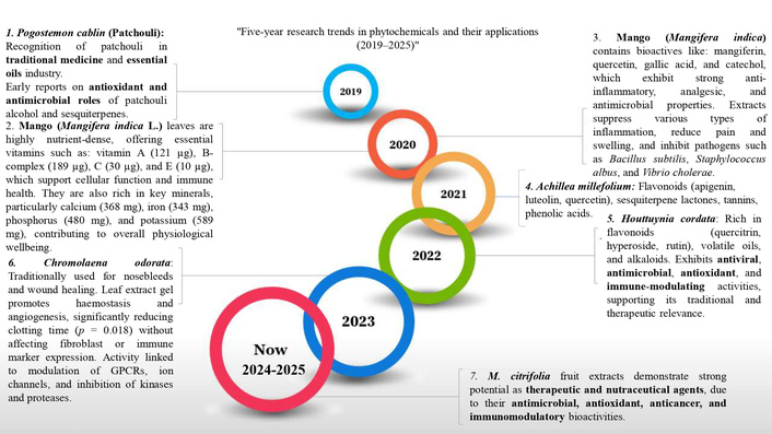 The significant medicinal constituents and pharmacological potential of several botanicals suggest promising therapeutic applications. Scorzonera undulata displayed a diverse phytochemical profile, with 25 volatile and 21 phenolic compounds identified, including quinic and chlorogenic acids, along with flavonoids such as kaempferol, apigenin, luteolin derivatives, quercitrin, and naringin—mostly concentrated in the aerial parts. These extracts exhibited notable antioxidant, antimicrobial, anti-inflammatory, and cytotoxic activities, especially methanolic extracts against MCF-7 breast cancer cells, indicating therapeutic relevance. Andrographis paniculata extracts, rich in andrographolide, showed clinical potential in alleviating mild COVID-19 symptoms. However, the compound’s nonlinear pharmacokinetics highlight the need for optimized delivery strategies. Morinda citrifolia fruit extracts demonstrated considerable in vitro antimicrobial effects and moderate cytotoxicity, supported by UPLC–Orbitrap MS identification of unique bioactives. These findings reinforce the need for further pharmacological and clinical validation. The antiviral efficacy of Houttuynia cordata against dengue virus type 2 was evident, with aqueous extracts showing strong virucidal action and inhibition of viral replication. Hyperoside was identified as the dominant active constituent, supported by a rich phytochemical profile including flavonoids, aristolactams, and triterpenoids. Genotoxicity assessments indicated a favorable safety profile, suggesting potential for phytotherapeutic development. Achillea millefolium (yarrow) contained essential oils enriched in camphor, 1,8-cineole, artemisia ketone, and azulene derivatives, alongside phenolic acids and flavonoids like chlorogenic acid, apigenin, luteolin, and quercetin. These contributed to its antioxidant, anti-inflammatory, antimicrobial, and hemostatic effects, validating traditional medicinal applications and warranting clinical standardization. Flavonoids such as luteolin and apigenin offered anticancer and cardiovascular benefits by inhibiting PD-L1 via STAT3 suppression and promoting autophagy to counter vascular calcification. Bryophyllum pinnatum demonstrated broad pharmacological activity attributed to bufadienolides, flavonoids, and phenolic acids, supporting its ethnomedicinal use while emphasizing the need for clinical safety validation.