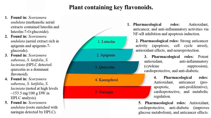 Hence, the phytochemical profiling across different Scorzonera species and related medicinal plants confirms that recurrent flavonoids—luteolin, apigenin, quercetin, kaempferol, and naringin—are present in multiple extracts. These flavonoids consistently demonstrate overlapping antioxidant, anti-inflammatory, anticancer, cardioprotective, and neuroprotective activities. For instance, S. undulata provides luteolin, apigenin, and naringin, while S. suberosa, S. latifolia, and S. laciniata contribute: rutin, myricetin, morin, quercetin, and kaempferol. Together, these findings justify that the therapeutic potential of these plants is largely driven by a shared flavonoid framework.