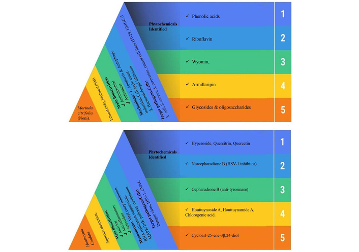 Noni extracts (ethanolic and methanolic) demonstrated significant antimicrobial and anticancer effects through induction of apoptosis and autophagy, supported by 17 identified bioactives, including phenolic acids, riboflavin, and novel metabolites such as wyomin and armillaripin.