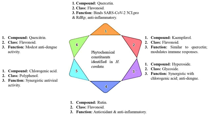 From a pharmacological perspective, the phytochemicals of HC can be grouped according to their primary activities. Chlorogenic acid and hyperoside contribute synergistically to antiviral action against dengue [19]. Quercetin and kaempferol not only enhance antiviral efficacy but also target COVID-19-related proteins such as 3CLpro and RdRp while regulating inflammatory mediators, including IL-6 and NF-κB [18, 19]. Quercitrin, another flavonoid, supports additional antiviral potential against dengue [19]. Collectively, these compounds provide a mechanistic basis for the observed therapeutic effects, reinforcing the role of HC as a promising phytotherapeutic agent against both COVID-19 and dengue infections.